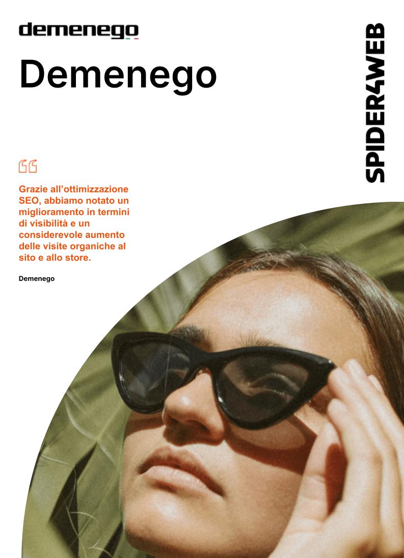 Demenego, con più di cinquant'anni di attività nel mondo dell'occhialeria, si colloca oggi tra le aziende italiane più attive e intraprendenti del settore eyewear. Dopo il successo di una ventina di negozi fisici, si sono affidati a Spider 4 Web per l'apertura di un sito istituzionale e di uno store online, supportato da ADV e attività di marketing digitale.
